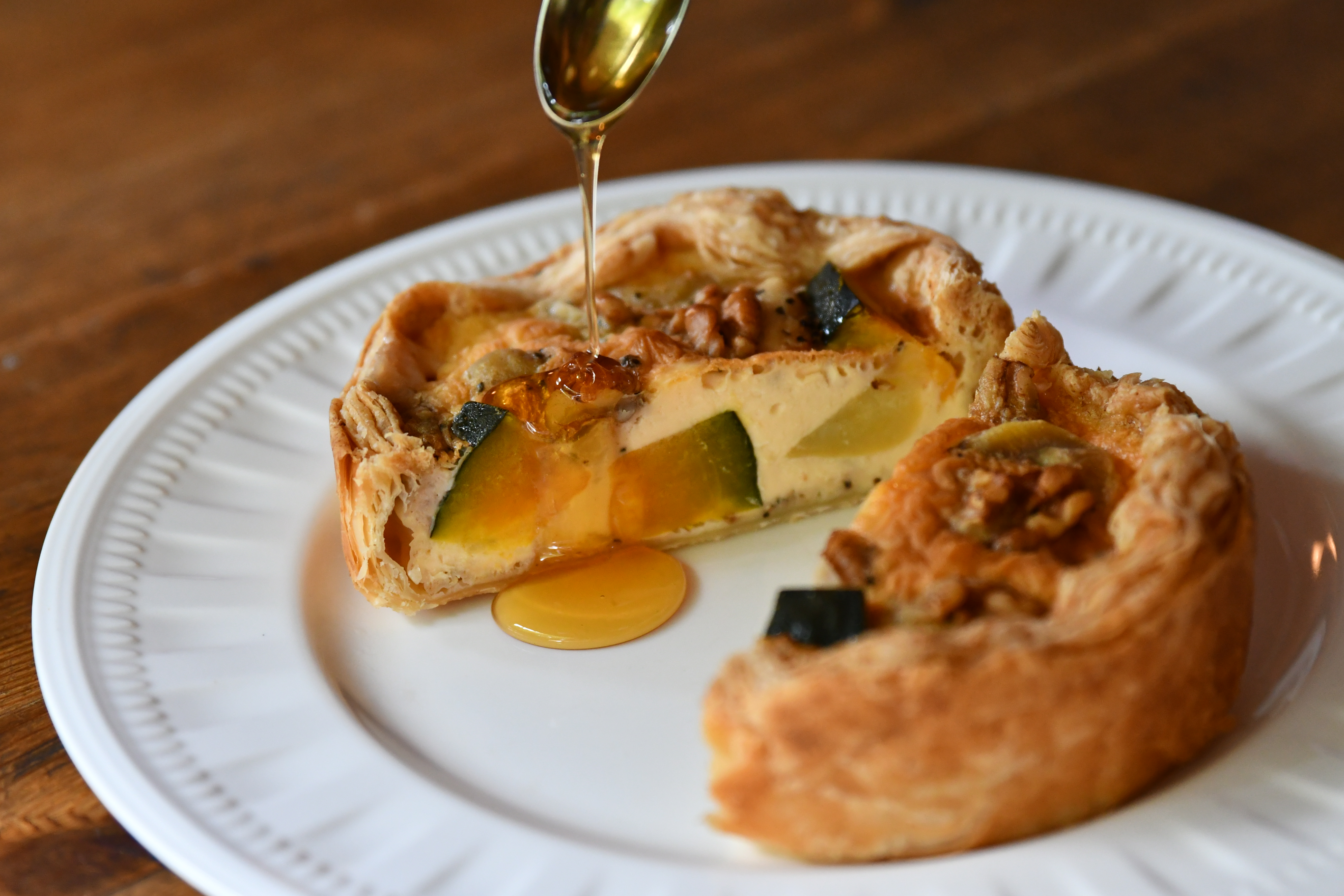栗、かぼちゃ、さつまいも、じゃがいもなど、秋の味覚をふんだんに詰め込んだキッシュ。ゴルゴンゾーラと胡桃が旨味を増して、秋野菜の美味しさを一層引き立たせています。
