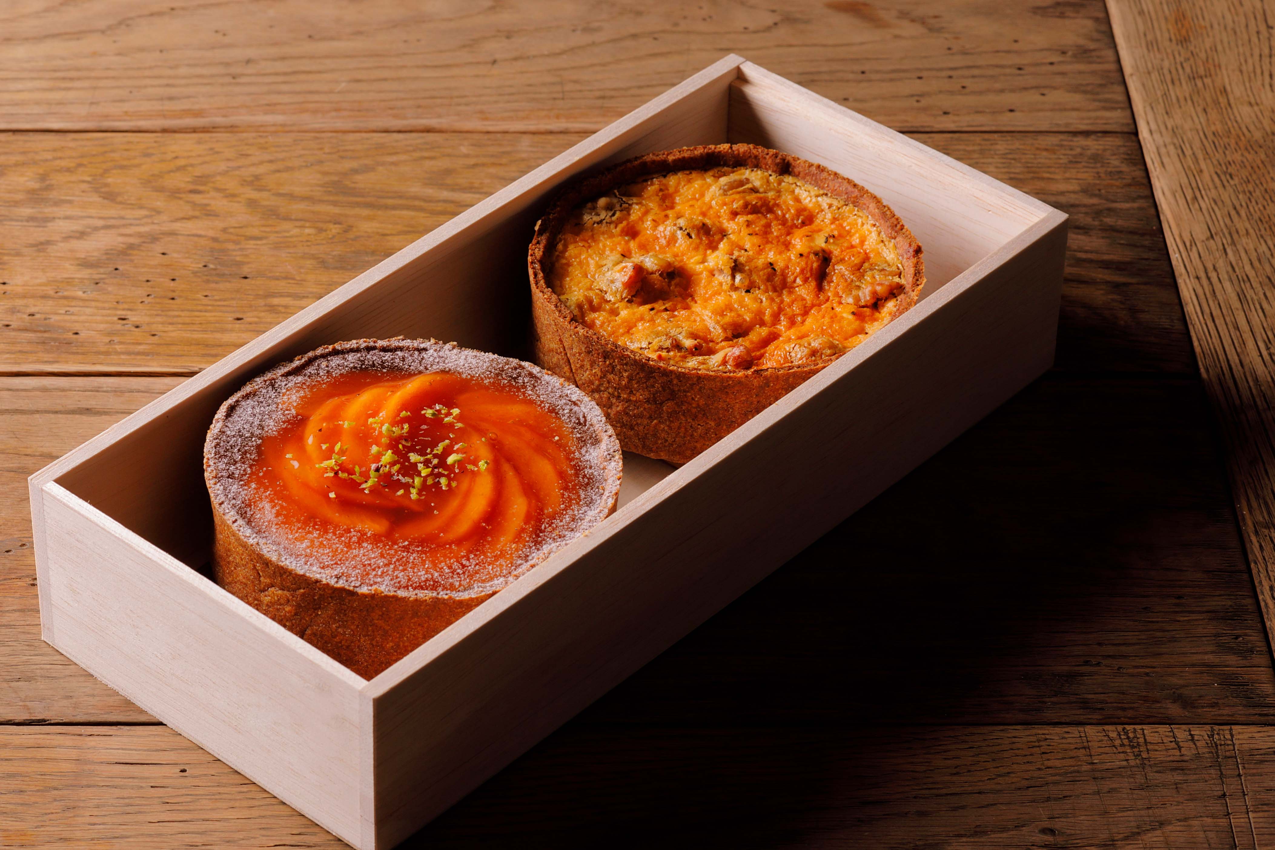 お芋の甘みを最大限に活かした安納芋のキッシュと、五條市の果樹農家「平井農園」の柿をふんだんに使用したデザートタルトのコンビ。