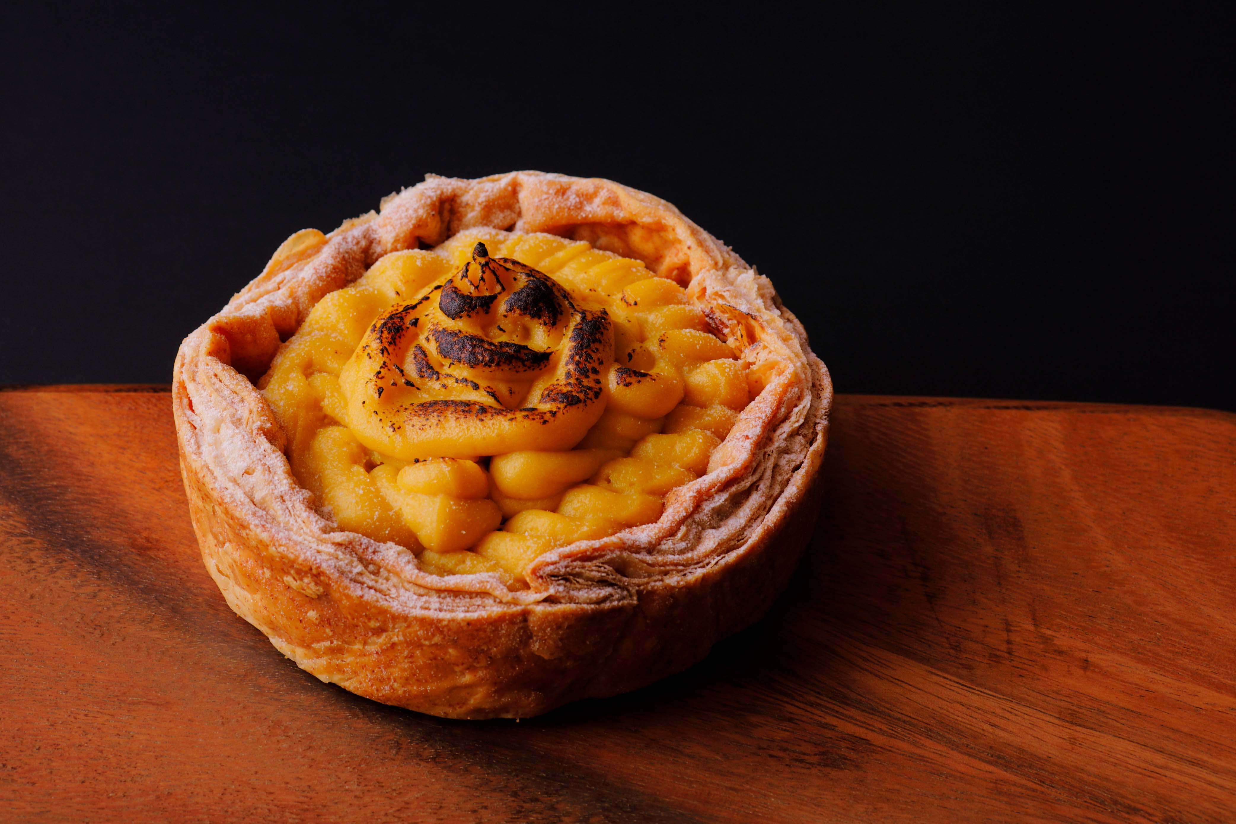 生地の一番下にアーモンドクリーム、真ん中にクリームチーズ、一番上に安納芋クリームをたっぷりと重ねます。3層のクリームが絶妙にマッチしたデザートパイ。
