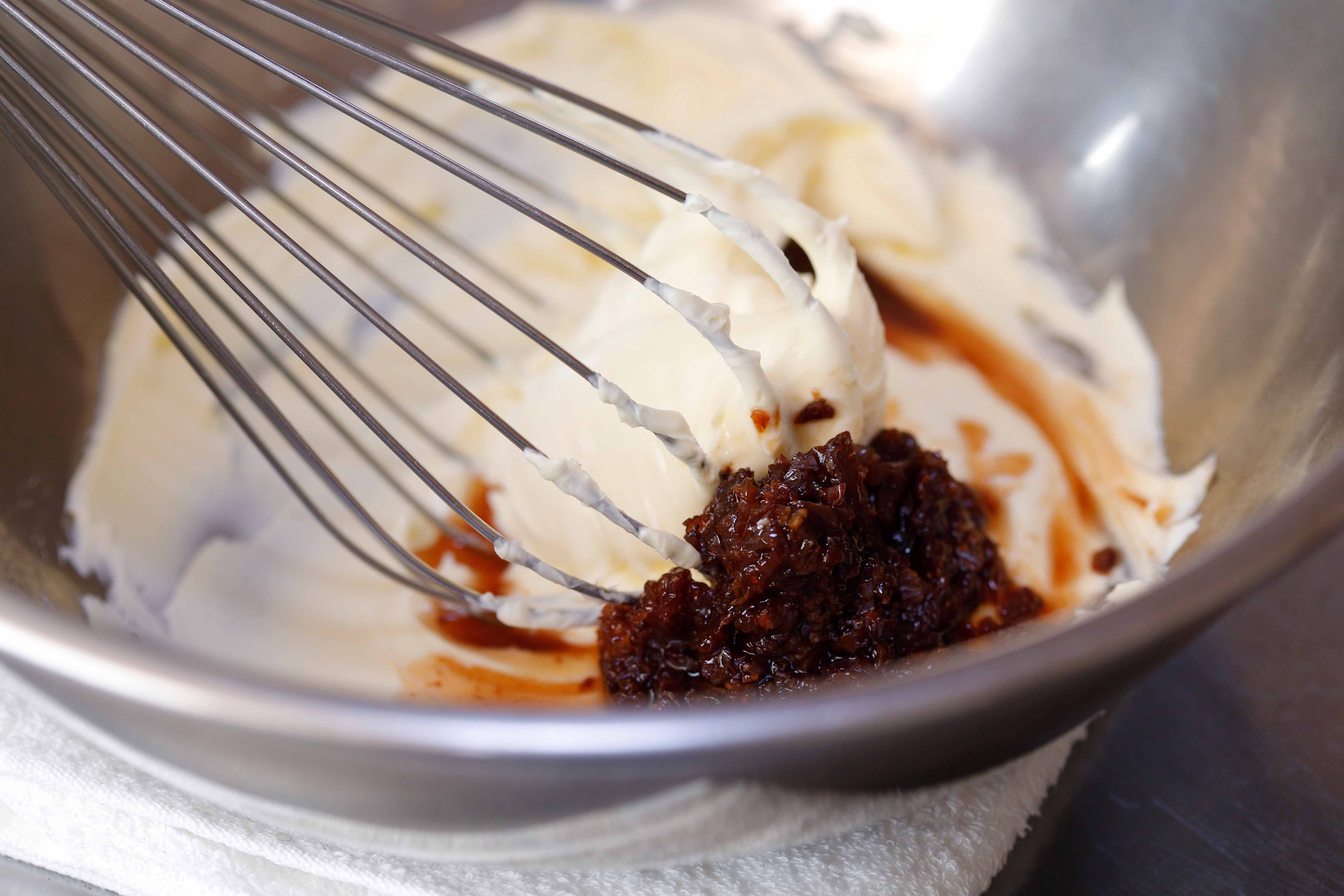 クリームチーズには、赤ワインとラム酒でつけ込んだラムレーズンを細かく粉砕したものを混ぜ込んでいます。このクリームを真ん中に閉じ込め、安納芋との甘さのバランスを整えています。