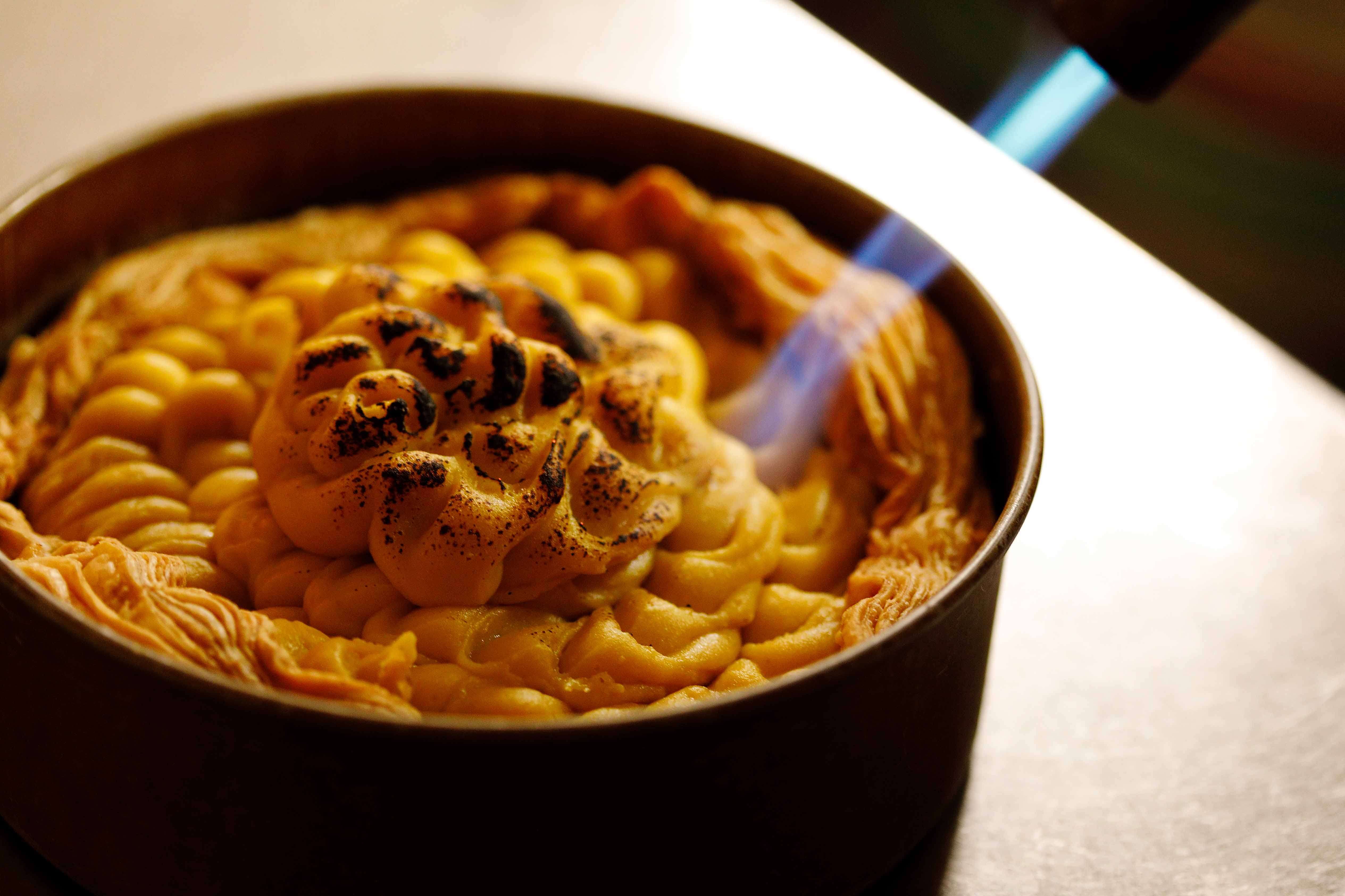 主役は安納芋クリーム。実は、白あんを少し混ぜ込んでいます。そこに生クリームを足してスイートポテト風に仕上げると、なめらかな口当たりで美味しくなります。バーナーで焦げ目をつければ完成。