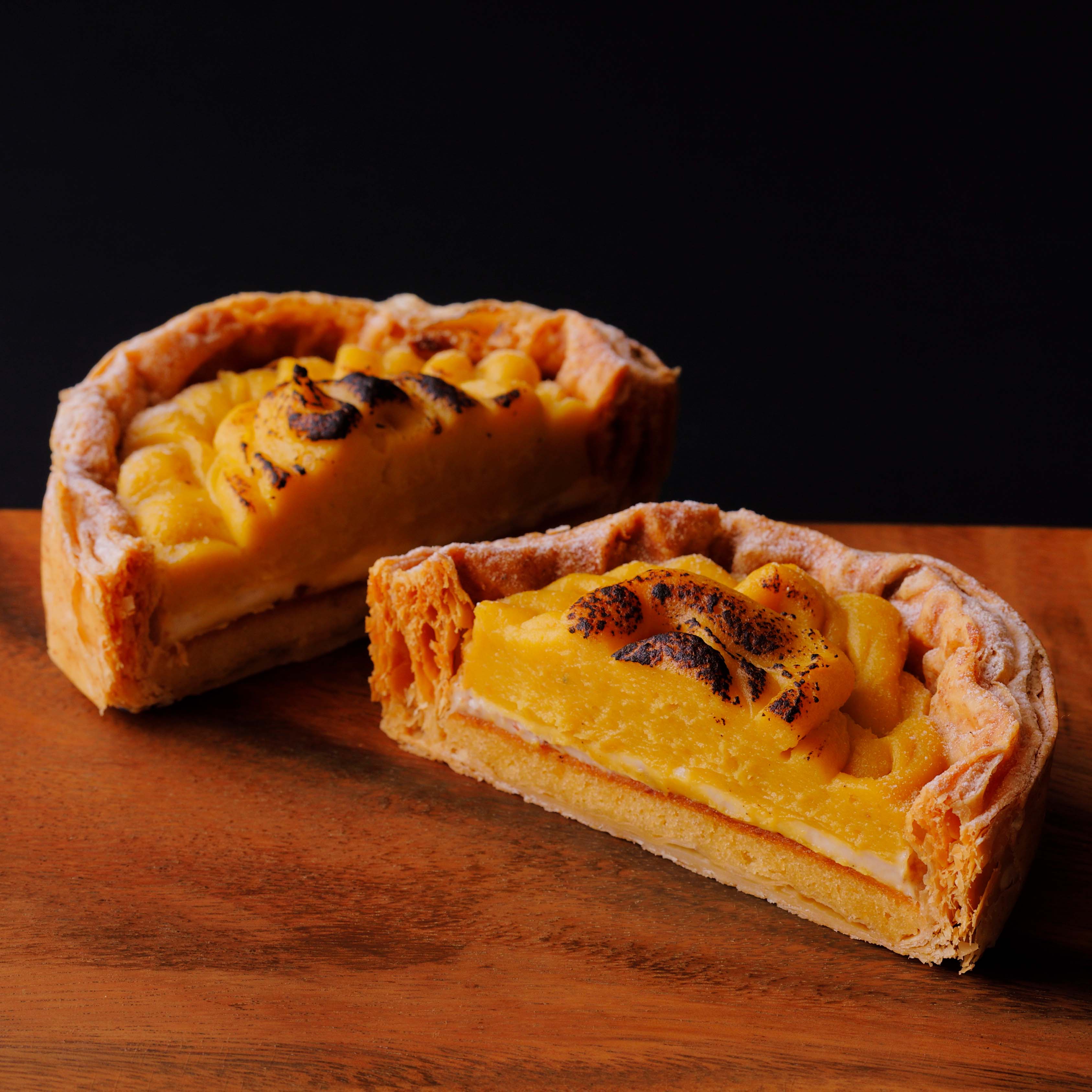 生地の一番下にアーモンドクリーム、真ん中にクリームチーズ、一番上に安納芋クリームをたっぷりと重ねます。3層のクリームが絶妙にマッチしたデザートパイ。