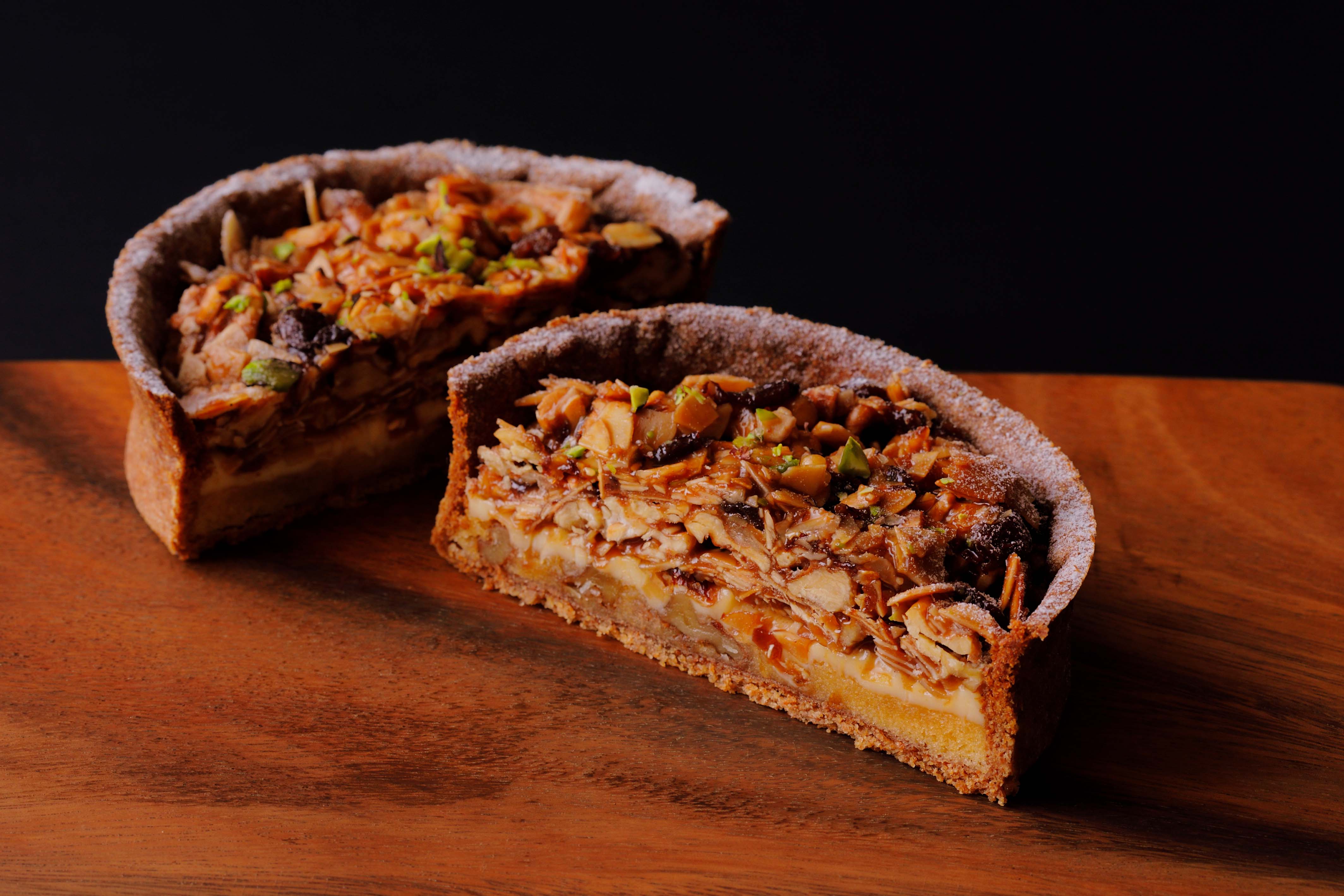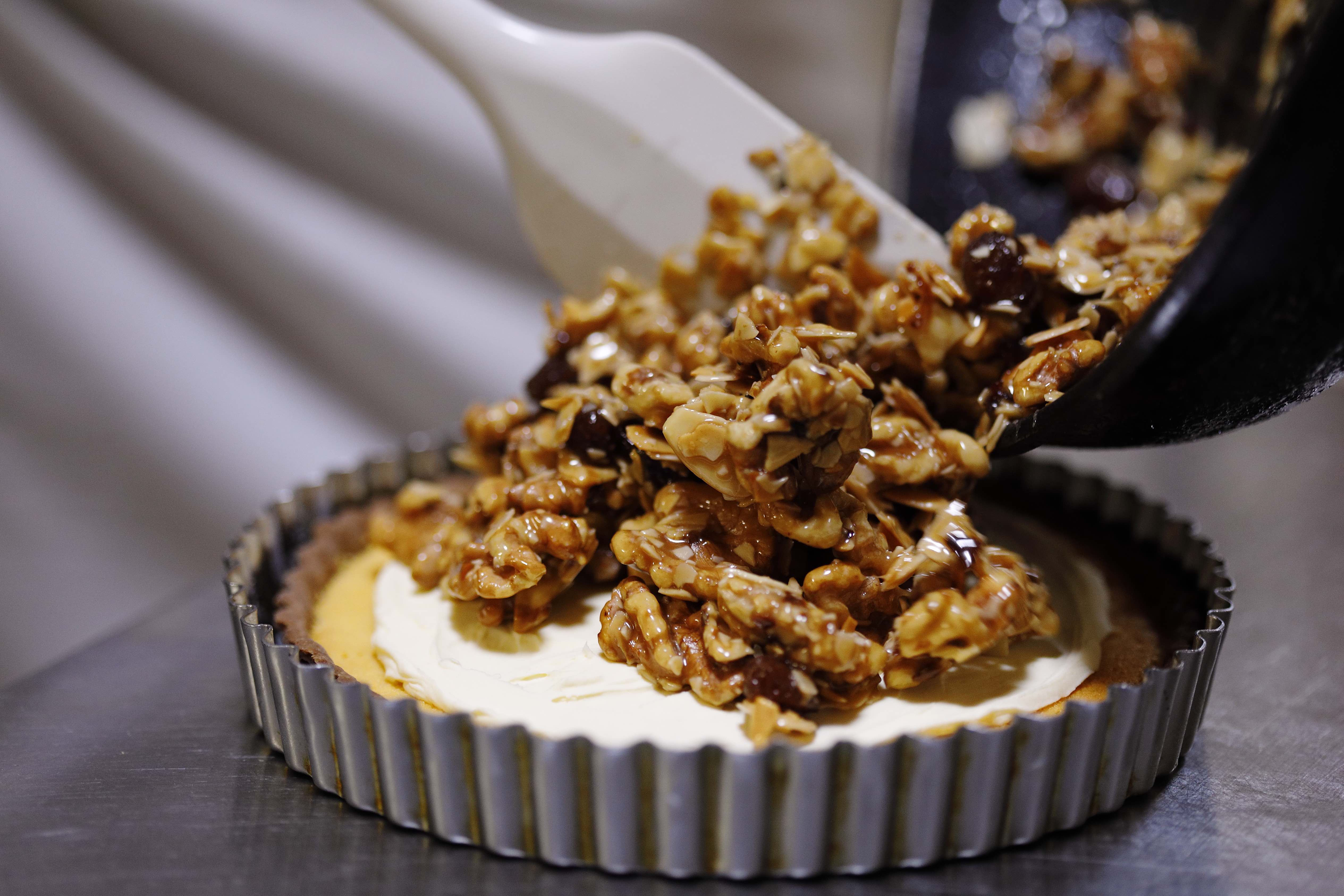 アーモンド、胡桃、レーズン、ピスタチオをふんだんに使用しているため、ナッツをそのまま食べている感覚のタルトです。生地にふんわりと山盛りの状態で盛り付け、あとは固めるだけ。